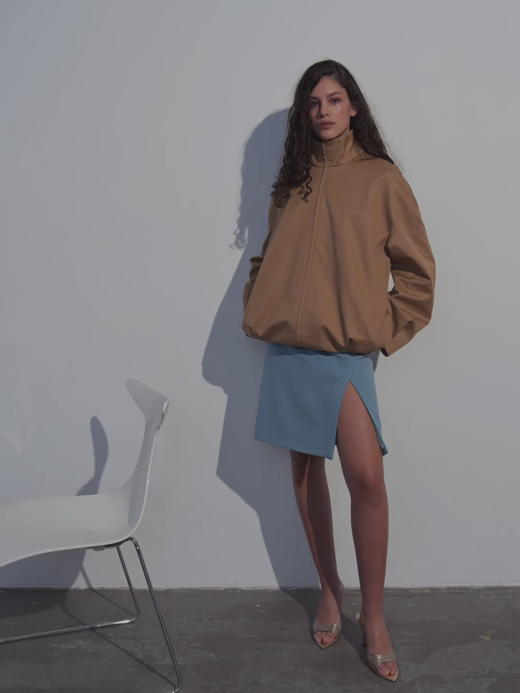 An oversized bomber in a soft dense fabric, creating a voluminous yet more fluid silhouette. The subtle matte texture adds depth to the color and a tactile feel. A stand collar and delicate embroidery complete the look.