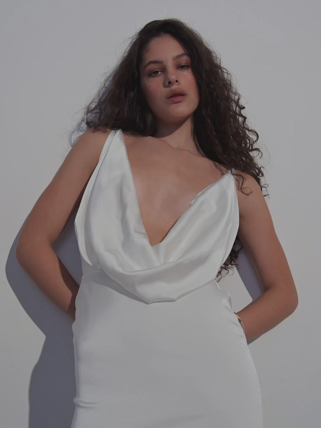 A dress crafted from viscose with elastane, shaping an elongated silhouette while adapting to the body. The deep neckline and open back define the lines, balancing sensuality with restraint. Delicate crystal detailing adds a refined accent. A fluid piece designed for summer and evening wear.