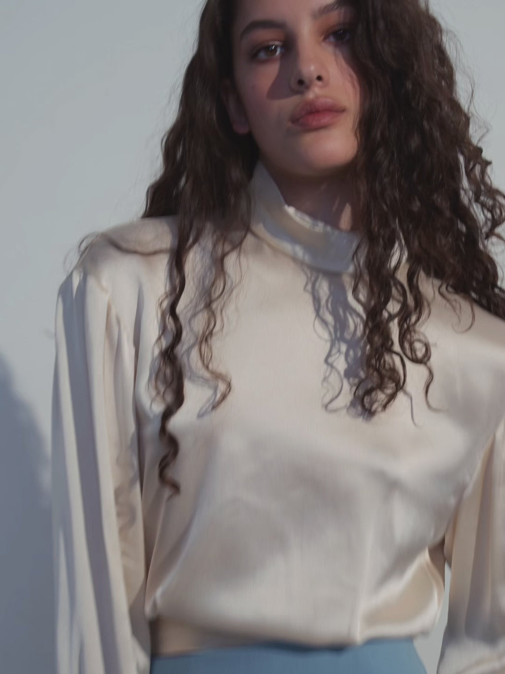 A satin blouse with a high stand collar and an open back, shaping a refined and composed silhouette. Soft viscose with a subtle sheen moves fluidly with the body, maintaining a cool, effortless feel. Adjustable ties allow for a custom fit and multiple styling options.